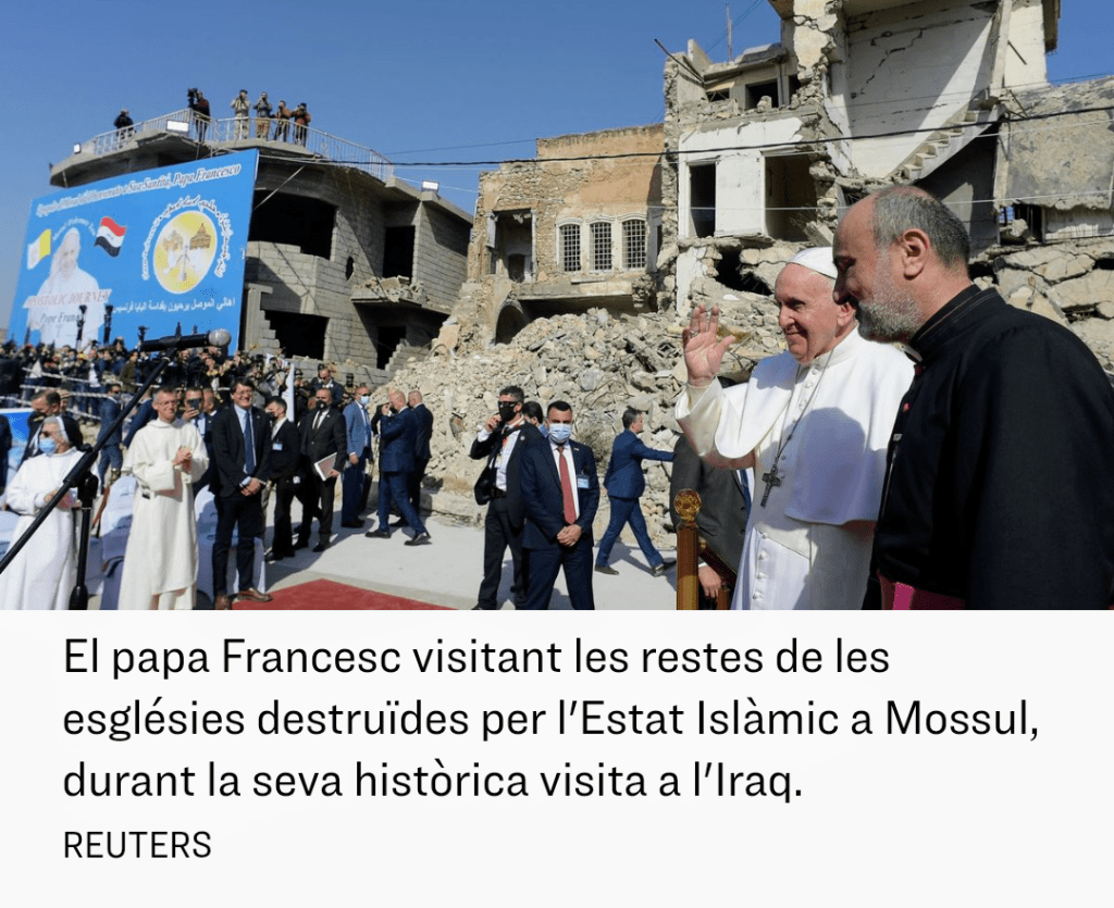 El papa Francesc ha acabat aquest diumenge una visita oficial de tres dies a l’Iraq, un país que cap pontífex havia trepitjat mai i que els últims anys ha estat especialment castigat per les guerres, la violència sectària i el jihadisme terrorista. La zona nord del país, el Kurdistan iraquià, va patir l’ocupació dels milicians de l’Estat Islàmic, que van situar a Mossul la capital del seu califat. Els jihadistes van imposar el terror entre la població civil i van massacrar les comunitats cristiana i yazidita que hi viuen juntament amb els musulmans des de fa segles. Per això ha estat especialment significativa la visita del Papa a aquesta ciutat, on va aprofitar per fer un al·legat contundent en contra de les guerres i de la violència. El Sant Pare també ha volgut traslladar el seu escalf a les comunitats cristianes de tot el Pròxim Orient, que han estat i són perseguides encara fins al punt que en molts llocs ja només en queda una presència testimonial.
