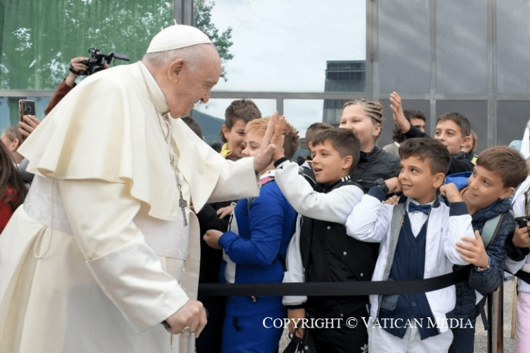 A su llegada a la Piazzale frente al Pala-Eventi de Santa Maria degli Angeli, el Papa fue recibido en el Teatro Lyrick por tres jóvenes, en representación de los participantes en el evento; por el Prefecto del Dicasterio para el Servicio del Desarrollo Humano Integral, el Card. Michael Czerny, S.I.; el Arzobispo-Obispo de Asís-Nocera Umbra-Gualdo Tadino, y de Foligno, Monseñor Domenico Sorrentino; la Presidenta de la Región de Umbría, Dra. Donatella Tesei; el Prefecto de Perugia, Dr. Armando Gradone; el Alcalde de Perugia, Dr. Francesco C. G. M., y el Presidente de la Región de Umbría, Dr. Francesco C. M. S., de la Provincia de Perugia. Armando Gradone; la Alcaldesa de Asís y Presidenta de la Provincia de Perugia, Dra. Stefania Proietti; los miembros del Comité Promotor del Evento, Prof. Luigino Bruni; la Dra. Francesca di Maolo y Sor Alessandra Smerilli, F.M.A, y por Representantes de las Familias Franciscanas de Asís y Pro Civitate Christiana.