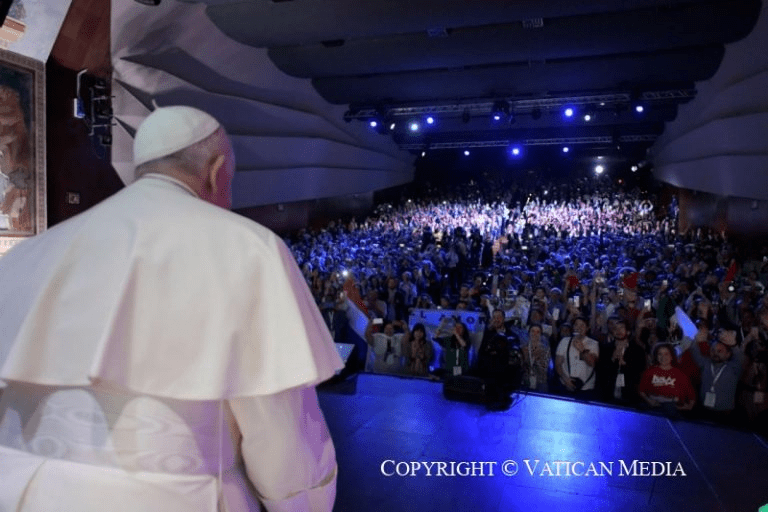 Queridos jóvenes, ¡buenos días! Saludo a todos los que habéis venido, que habéis tenido la oportunidad de estar aquí, pero también quiero saludar a todos los que no han podido llegar, que se han quedado en casa: ¡un recuerdo para todos! Estamos unidos, todos nosotros: ellos desde su lugar, nosotros aquí.