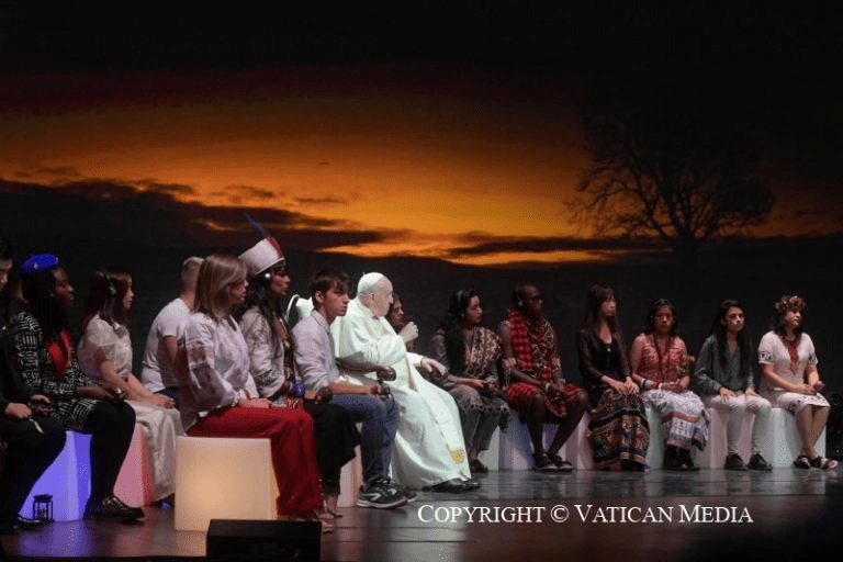 A las 9.50 de la mañana el Papa Francisco llegó al escenario del Teatro Lyrick donde comenzó el encuentro con los jóvenes. Tras varios momentos musicales y teatrales y los testimonios de ocho jóvenes, el Papa Francisco pronunció su discurso. Inmediatamente después, se procedió a la lectura y firma del «Pacto».