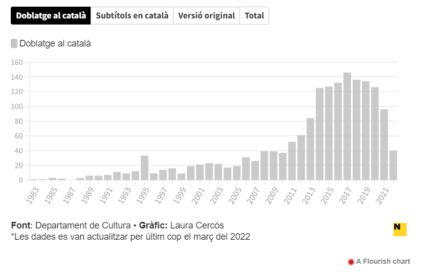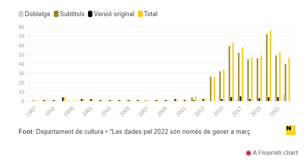 Si has notat que les opcions de veure pel·lícules en català s’han reduït els últims anys, no vas errat. Entre el 2018 i el 2021, el nombre de pel·lícules estrenades en català es va reduir gairebé un 20%, passant de 869 a 700 en només quatre anys segons l’anàlisi feta per ElNacional.cat de la base de dades de cinema en català del Departament de Cultura. L’impacte de la pandèmia, les inversions insuficients i la irrupció de noves plataformes han deixat al català en una situació més feble del que s’havia aconseguit després d’anys d’esforços per augmentar la presència de la llengua en el panorama audiovisual. Des del 2012, les produccions en català, els doblatges i les subtitulacions en aquesta llengua havien crescut d’una manera excepcional fins a arribar als màxims del 2018 —136 pel·lícules doblades, 668 subtitulades i 65 originals en català. A partir d’aleshores, però, l’oferta audiovisual en català no ha fet més que disminuir fins a arribar a les baixes xifres de l’any passat, que no es veien des del 2015.