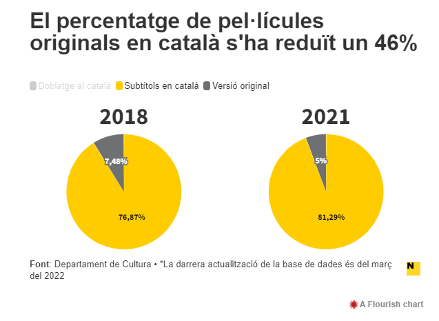 Fomentar la presència del català en tots els àmbits de les nostres vides, sobretot entre els més joves, és una prioritat de les polítiques lingüístiques de l’actual govern. Per ara, però, tot i els èxits aclaparadors i la visibilitat internacional que han aconseguit algunes pel·lícules com Alcarràs, les produccions originalment en català representen una petita part de la cartellera. L’any passat es van estrenar 35 pel·lícules produïdes en català—el 5% del total disponible en aquesta llengua—, gairebé la meitat de produccions estrenades quatre anys enrere, el 2018, l’any en què es van estrenar més pel·lícules de versió original catalana —65.