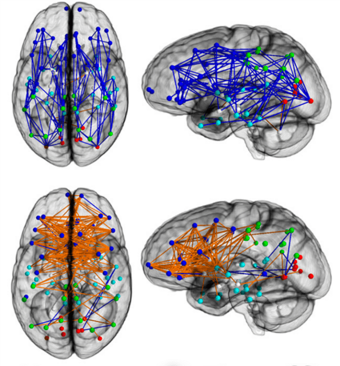 Los cerebros masculinos tienen más conexiones dentro de cada hemisferio (líneas azules). Los cerebros femeninos tienen más conexiones entre los dos hemisferios (líneas tostadas).