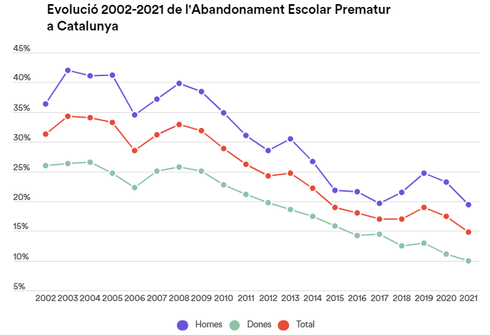 La xifra d’abandonament escolar prematur (AEP) que teníem fins ara (segons dades de 2020) era, a Catalunya, del 17,4% de joves entre 18 i 24 anys que no tenen cap titulació més enllà de l’ESO i que declaren que no estan estudiant. Espanya, amb un 16% de mitjana, es trobava en una vergonyosa primera posició a Europa, i Catalunya per sobre de la mitjana espanyola i molt per davant d’altres comunitats autònomes amb indicadors de nivell de vida similars als nostres.