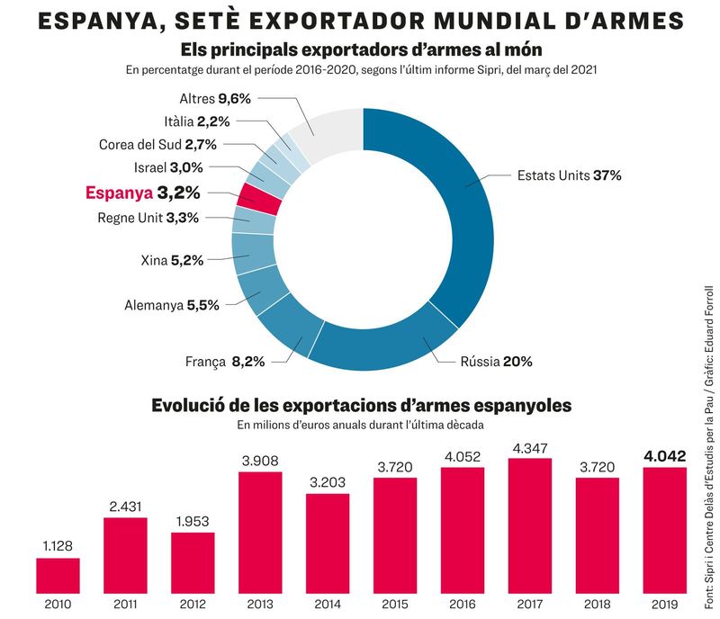 Hi ha un sector de l’economia espanyola que no pateix tant les crisis: la indústria militar. Fa una dècada que Espanya forma part del top 10 dels països que més armes exporten al món, un lloc molt per sobre de la seva capacitat econòmica o del seu pes polític mundial. Segons l’últim informe de l’Stockholm International Peace and Research Institute (SIPRI), publicat fa dues setmanes, ocupa la setena posició en el rànquing mundial d’exportadors d’armes en el període 2016-2020, només per darrere de les grans potències militars del planeta: els Estats Units, Rússia, França, Alemanya, la Xina i el Regne Unit. El 2018 es va situar en cinquè lloc. En els últims anys, un 3,2% de totes les armes que s’han venut al món van ser fabricades a Espanya, amb les corresponents autoritzacions per comercialitzar-les del govern de Madrid. Les exportacions d’armes made in Spain s’han disparat un 295,4% entre el 2010 i el 2019. Tot un negoci que creix en l’opacitat, emparat en la Llei de Secrets d’Estat.