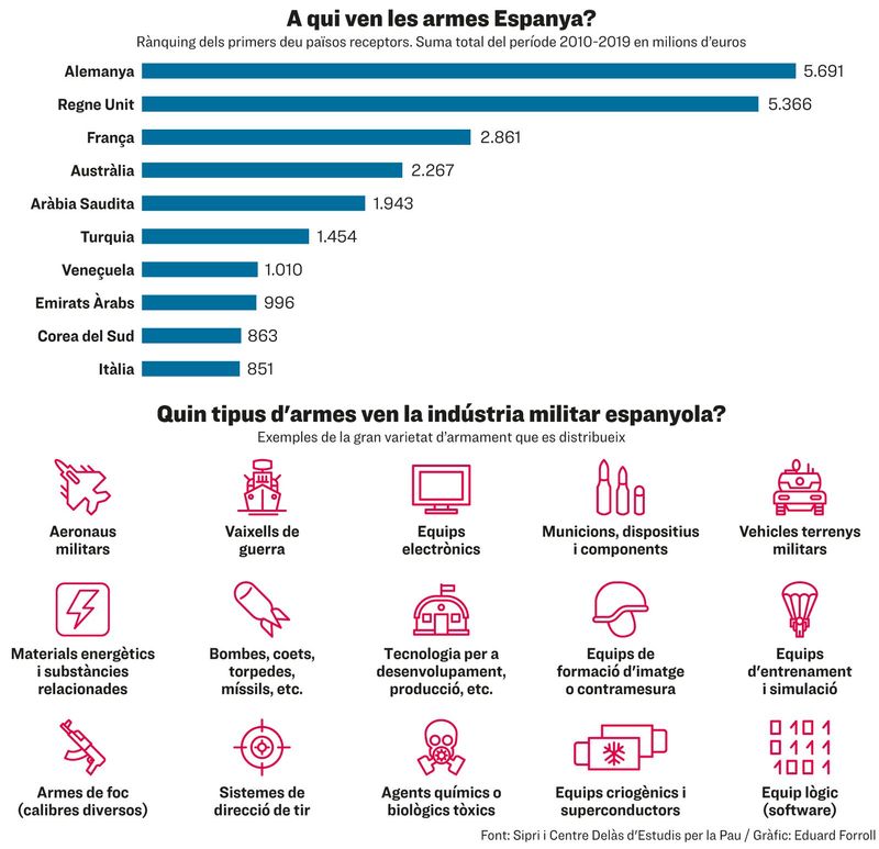 ¿I qui compra les armes espanyoles? Segons les últimes estadístiques oficials, que corresponen al primer semestre del 2020, el 71% de les exportacions de material de defensa es van destinar a països de l’OTAN (inclosa Turquia), que en molts casos corresponen a projectes militars conjunts de la UE, que intenta harmonitzar els 27 exèrcits dels estats membres perquè puguin actuar de manera conjunta. La resta es van vendre a l’Aràbia Saudita, el Kazakhstan, els Emirats Àrabs Units, Singapur i Oman. El govern, que ha d’autoritzar totes les exportacions, va paralitzar la venda de sistemes de control i llançament de míssils per a fragates a Birmània, aplicant els acords europeus. També es va exportar material policial i de seguretat a Togo, Tunísia, Portugal, els Estats Units i França, i el que es coneix com a material de doble ús (que pot tenir un ús civil però també militar, com sensors i software), de nou a l’Aràbia Saudita, els Estats Units i la Xina. En l’última dècada s’han accelerat les exportacions a l’Àsia i al Pròxim Orient, dues zones del planeta que viuen una autèntica cursa armamentista.Entre el 2010 i el 2019 Espanya va vendre material de defensa a l’Aràbia Saudita per valor de 3.736 milions d’euros