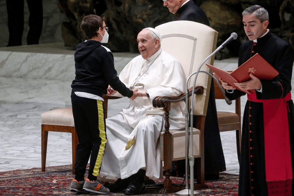 El Papa Francisco recibe a un niño durante su audiencia general de los miércoles en el Aula Pablo VI en la Ciudad del Vaticano.- EFE