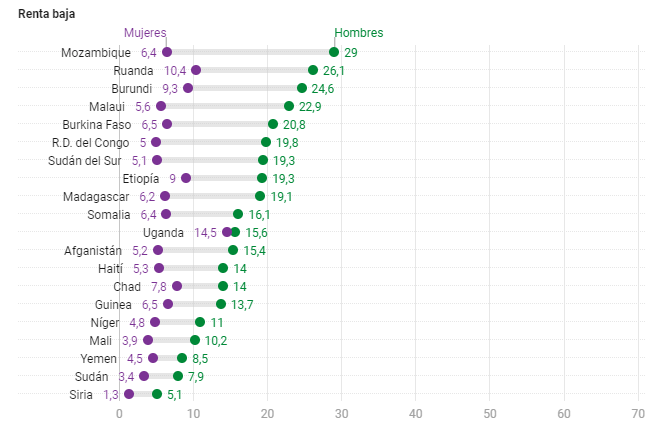 Tasa de suicidios por cada 100.000 habitantes, entre hombres y mujeres, en cada país. Datos de 2017. No hay datos para los países en gris